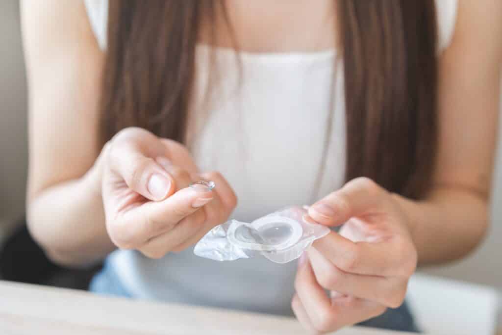 Based on findings, the optometrist selects a trial pair of contact lenses (soft, rigid gas permeable, toric, or multifocal). The lenses are placed on the eyes to assess fit, movement, centration, and comfort.
